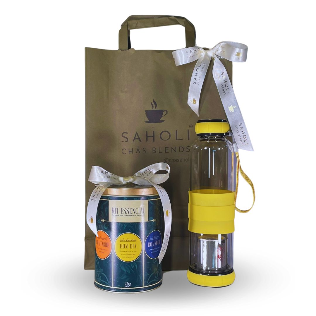Lata composta por 3 chás em saquinhos individuais, contendo 25g cada, mais uma garrafa da sua escolha.